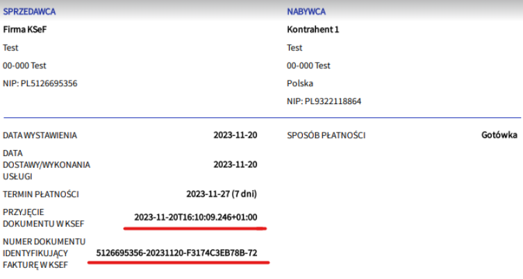 • datę i godzinę przyjęcia dokumentu w KSeF
