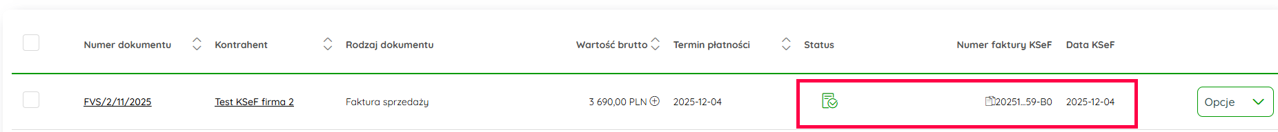 Dodatkowo w kolumnie Status w formie ikony zobaczysz informację o wysyłce faktury do KSeF