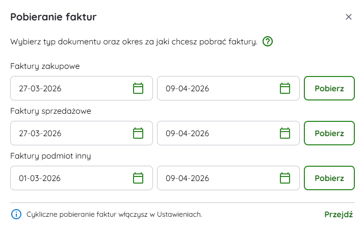 - Zobaczysz okno Pobierz faktury z KSeF.