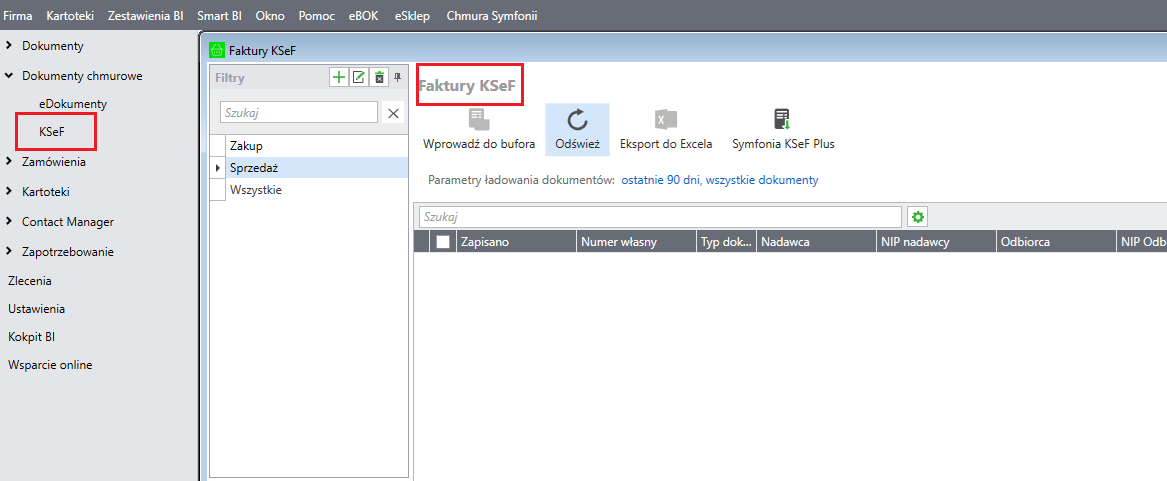 - Przejdź w Symfonia Handel lub Symfonia ERP Handel do menu Dokumenty chmurowe → KSeF.