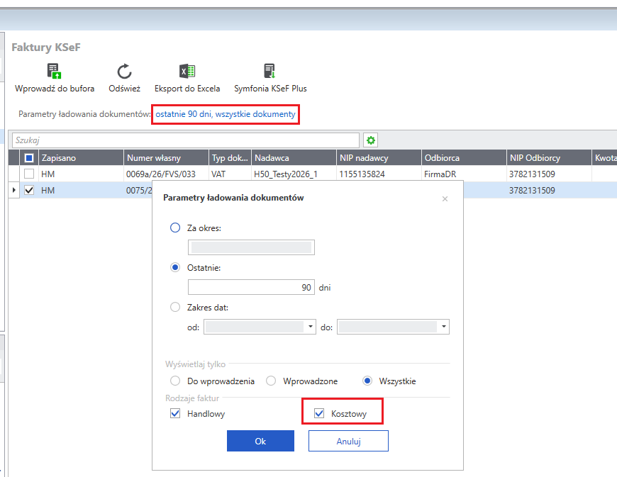 - Czy w Parametrach ładowania dokumentów zaznaczony jest parametr rodzaj faktury Kosztowy.