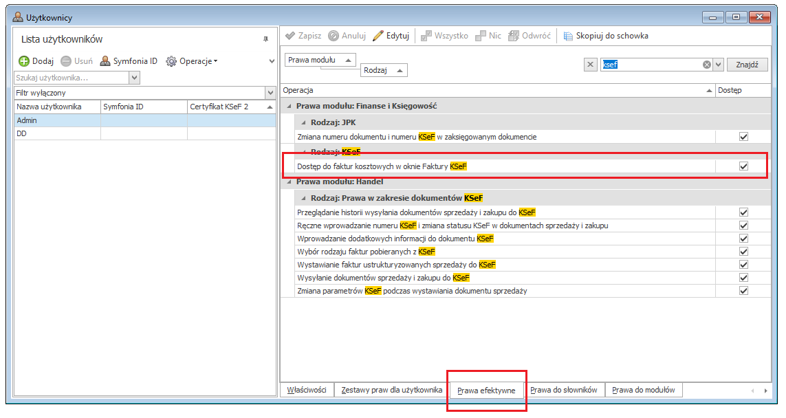- Czy użytkownik, w Administracji ma nadane prawa efektywne o nazwie Dostęp do faktur kosztowych w oknie Faktury KSeF.