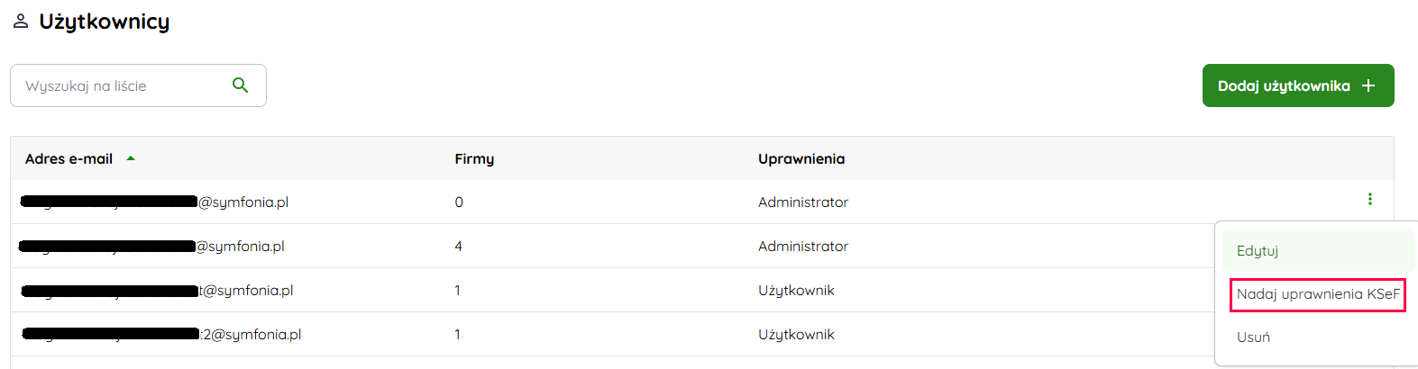 Kliknij w trzy kropki po prawej stronie użytkownika i wybierz Nadaj uprawnienia KSeF.
