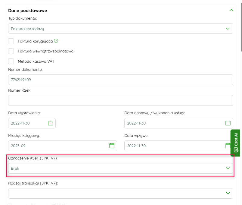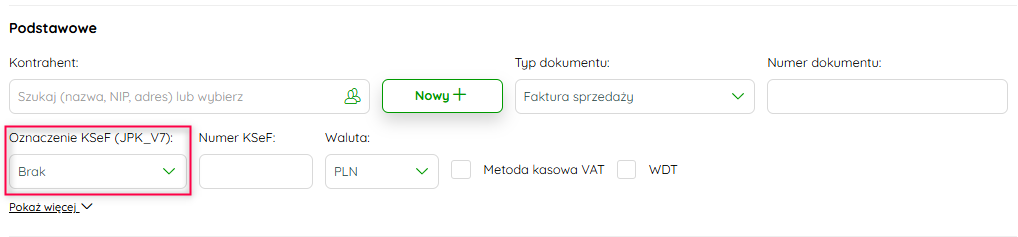 Oznaczenie KSeF ( JPK V7) – w sekcji Podstawowe