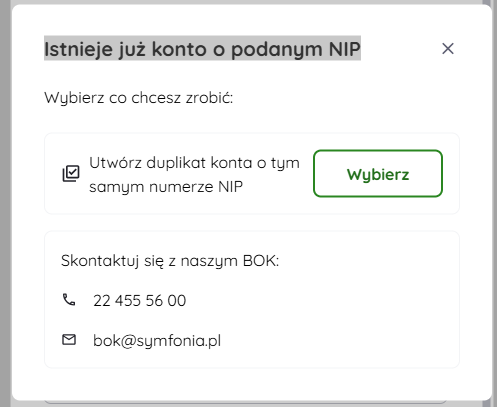 Jeżeli w momencie próby rejestracji nowego konta podajesz NIP podmiotu, którego konto na portalu już istnieje, otrzymasz komunikat informujący o istnieniu konta dla podanego NIP oraz umożliwiający utworzenie nowego konta jako duplikatu.