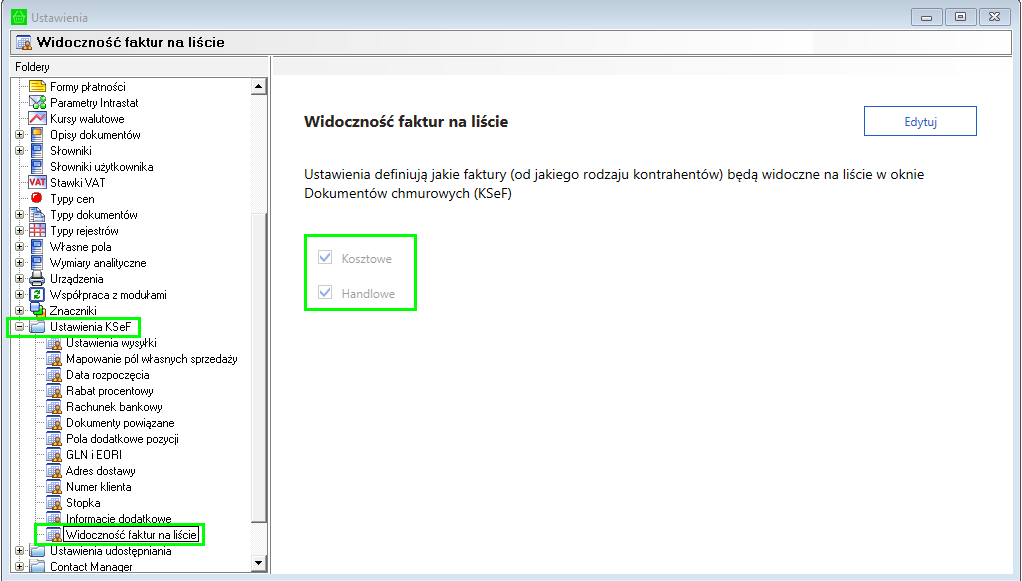 - Wejdź w Ustawienia → Ustawienia KSeF → Widoczność faktur na liście. Prawdopodobnie nie ma zaznaczonego żadnego parametru - zaznacz oba (Kosztowe, Handlowe).