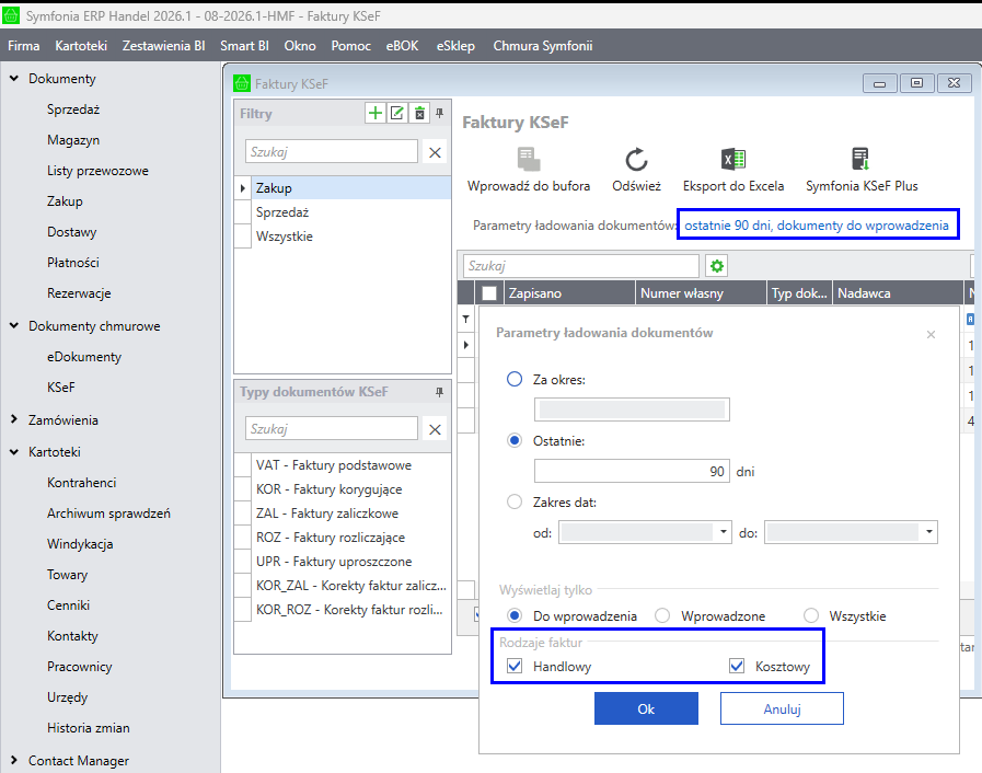 3. Wejdź w edycję filtra, klikając w niebieski napis Ostatnie X dni, dokumenty do wprowadzenia i zaznacz w sekcji Rodzaje faktur opcje: Handlowy oraz Kosztowy.