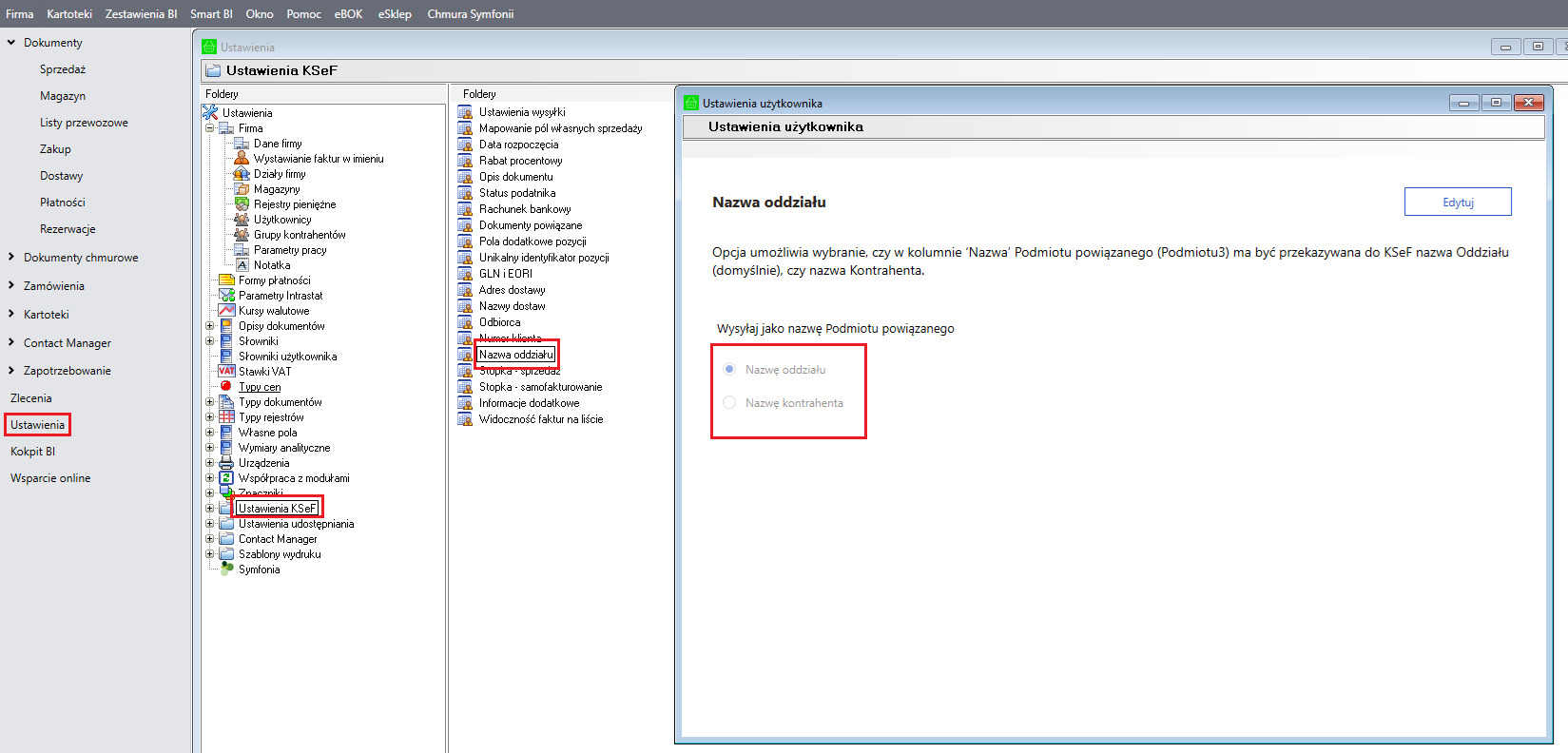 W kartotece Ustawienia → Ustawienia KSeF → Nazwa oddziału znajduje się parametr, który określa, jaka wartość będzie przekazywana do KSeF w kolumnie 'Nazwa' podmiotu powiązanego (Podmiot3).