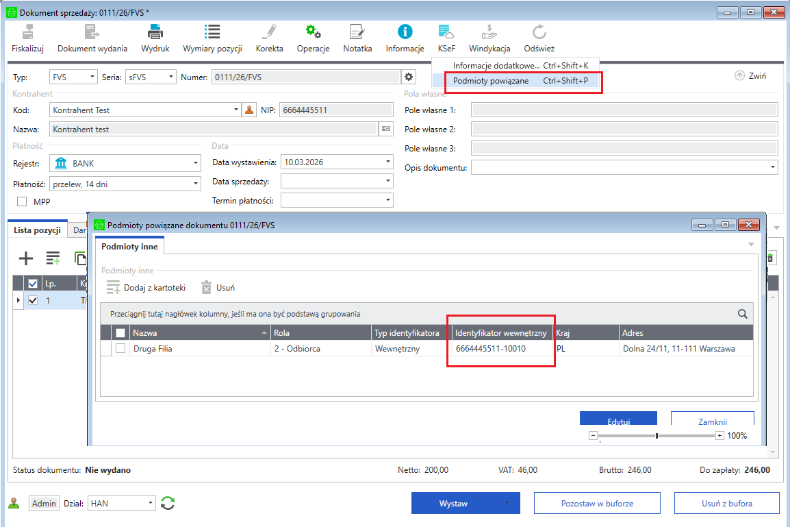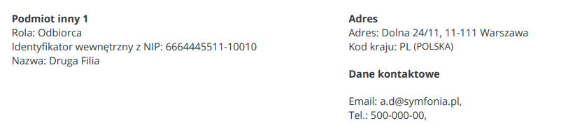 Jeśli w ustawieniach KSeF → Odbiorca zostanie wybrana opcja Dodaj Odbiorcę dokumentu do Podmiotów powiązanych z identyfikatorem podatkowym wybrany oddział zostanie dodany do faktury jako: