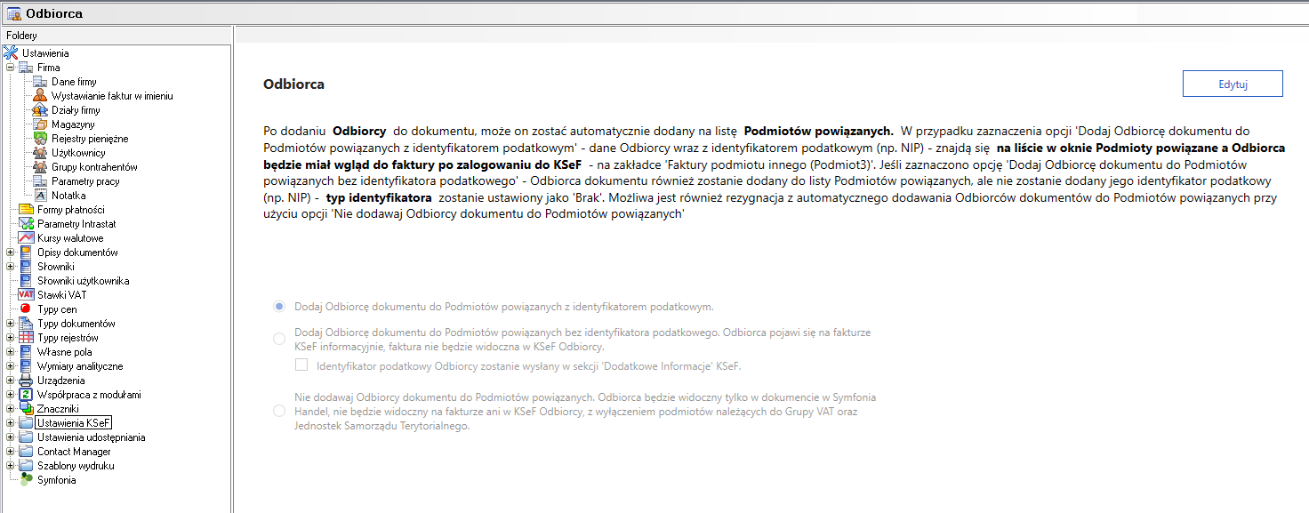 Przed przypisaniem identyfikatora wewnętrznego (IdWew) do kontrahenta należy sprawdzić parametry pracy, na których aktualnie działa Symfonia Handel. Parametry te znajdują się w kartotece Ustawienia → Ustawienia KSeF → Odbiorca. Służą on do określenia, czy kontrahent wskazany jako odbiorca dokumentu ma zostać automatycznie dodany do listy Podmiotów powiązanych oraz w jaki sposób ma być identyfikowany (z identyfikatorem podatkowym lub bez niego).