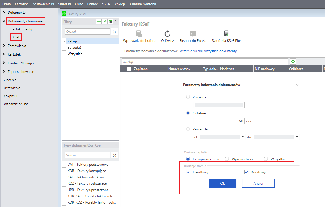 Okno Parametry ładowania dokumentów w oknie Faktury KSeF pojawią się po kliknięciu zakładki ostatnie 90 dni, wszystkie dokumenty.