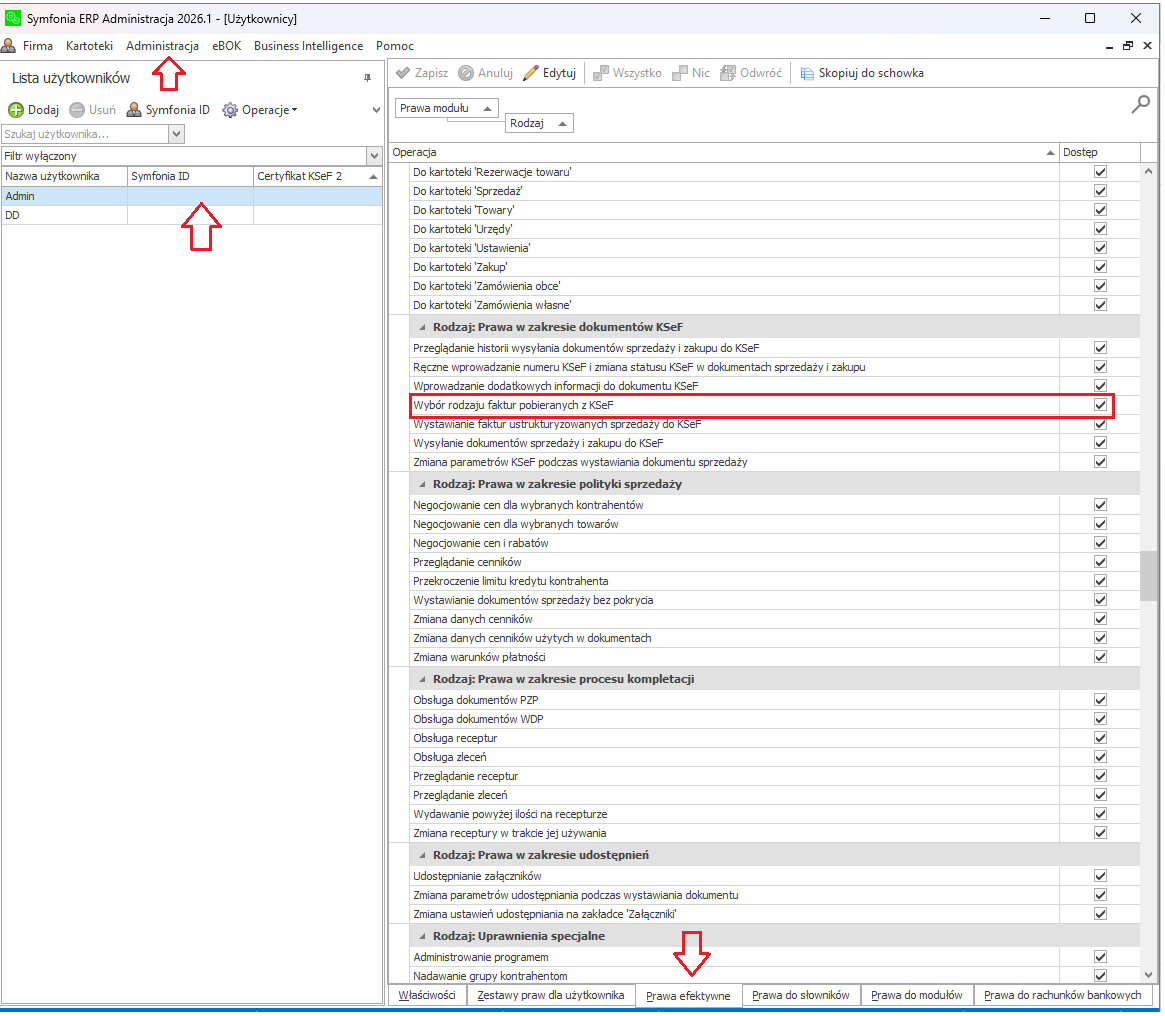 Dostępem do ustawienia steruje prawo Wybór rodzaju faktur pobieranych z KSeF z grupy Prawa modułu: Handel → Rodzaj: Prawa w zakresie dokumentów KSeF.