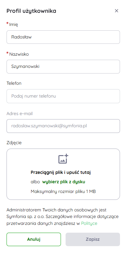 Użytkownicy korzystający z kont Symfonia ID mogą samodzielnie edytować część danych zapisanych w swoim profilu. Dotyczy to takich informacji jak: