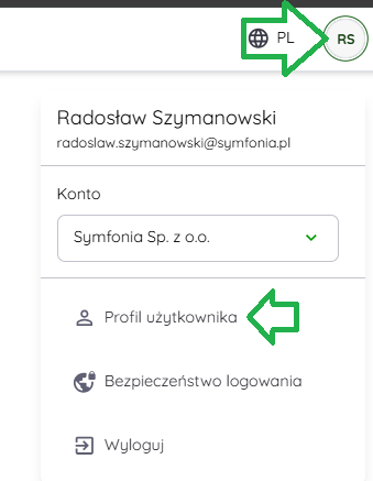 2. W prawym górnym rogu ekranu kliknij ikonę użytkownika z inicjałami:
