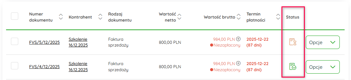 3. Informację o wysyłce faktury do KSeF znajdziesz w kolumnie Status.