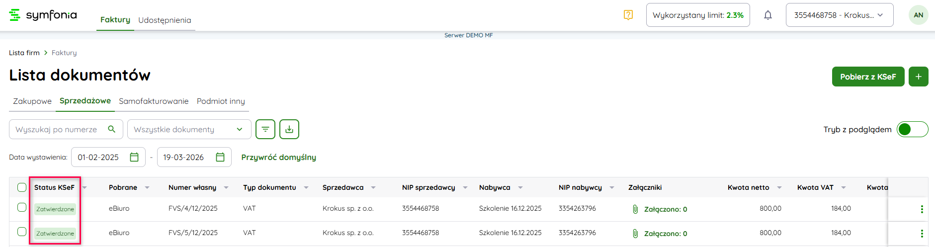 W Symfonii KSeF Plus zobaczysz wszystkie faktury sprzedaży wysłane do KSeF MF, w tym dokumenty wystawione zarówno w Symfonii Handel, jak i w Symfonii eBiuro.