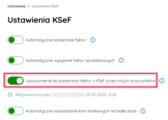 Zaznacz Upoważnienie do pobierania faktur z KSeF przez innych użytkowników.