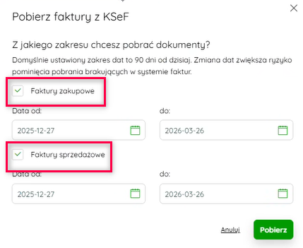 - Zobaczysz okno Pobierz faktury z KSeF.