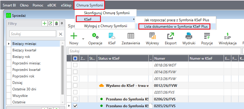 - Zaloguj się do Symfonii KSeF Plus z poziomu programu Symfonia Handel, np. z menu Chmura Symfonii→ KSeF →Listy dokumentów w Symfonia KSeF Plus