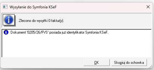 oznacza to, że dokument został już wysłany do Symfonia KSeF Plus i posiada przypisany unikalny identyfikator KSeF. W takim przypadku nie można go przesłać ponownie do Symfonia KSeF Plus.
