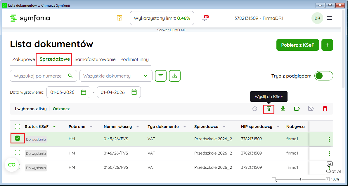 Z poziomu chmury wykonaj opcję Wyślij do KSeF.