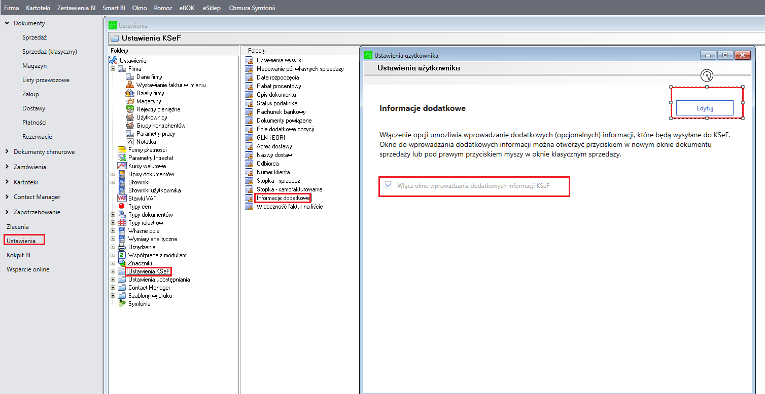 Jeśli panujesz na fakturze dodawać informacje dodatkowe włącz tę funkcjonalność w kartotece Ustawienia → Ustawienia KSeF→ Informacje dodatkowe