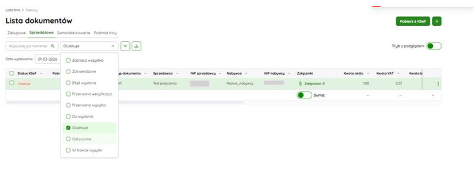 W rezultacie pojawią się te dokumenty, na których wystąpił problem, są one w statusie Oczekuje.