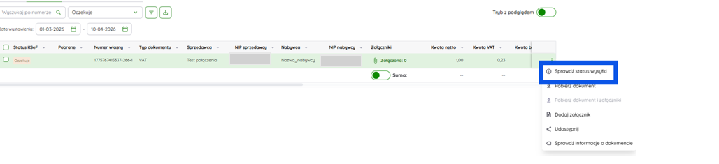 Należy na tych dokumentach wybrać opcję Sprawdź status wysyłki, czego rezultatem będzie pobranie numeru i daty KSeF poprzez API z portalu Ministerstwa Finansów.