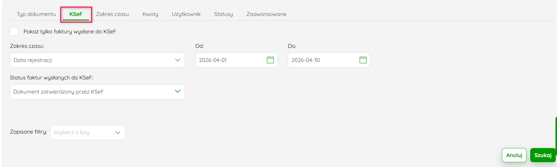 - Zaznacz jeśli potrzebujesz Pokaż tylko faktury wysłane do KSeF.