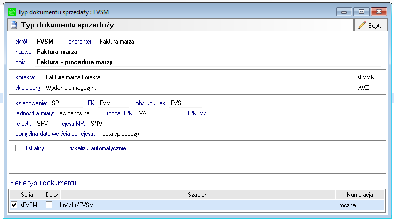 • dodaj dokument Faktura marża (FVSM) zgodnie z poniższym szablonem.