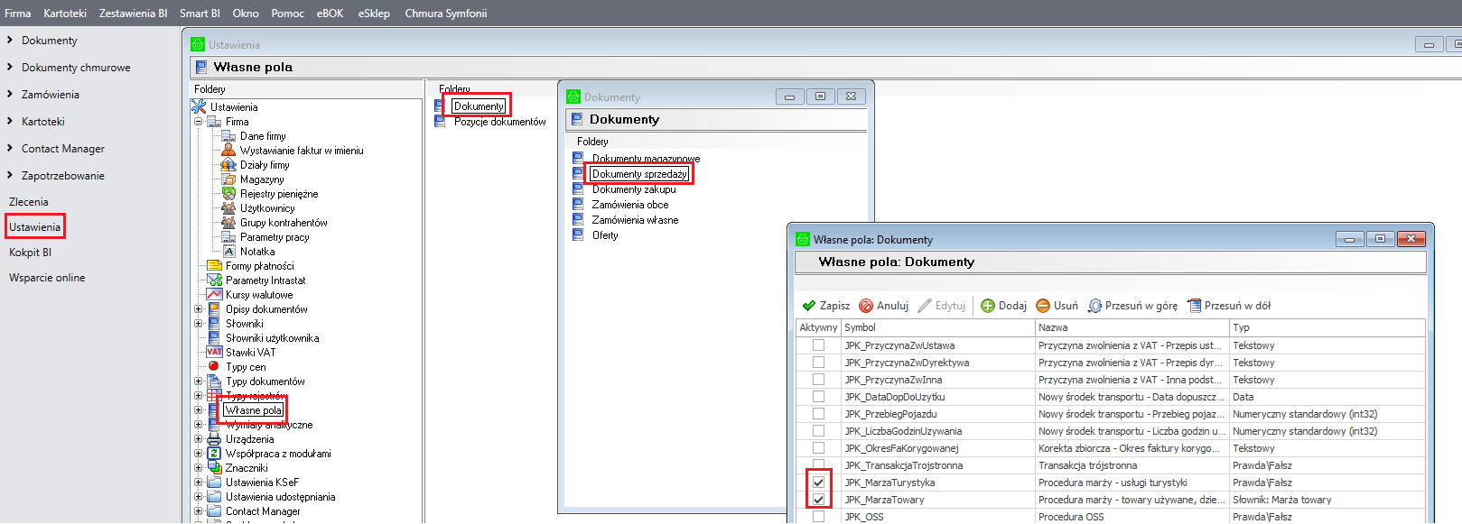 1. Wejdź do kartoteki: Ustawienia → Własne pola → Dokumenty → Dokumenty sprzedaży, a następnie zaznacz pola własne: