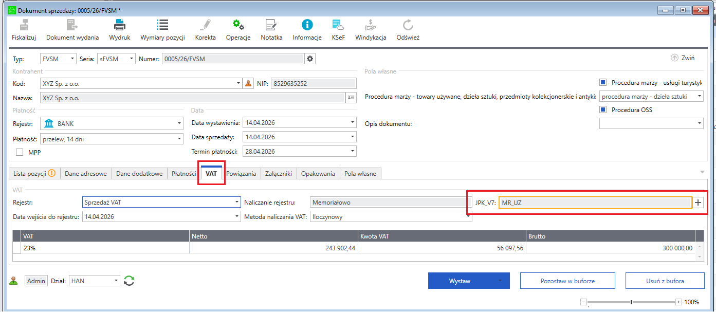 3. Przejdź do zakładki VAT i wybierz jeden z atrybutów w polu JPK_V7: MR_UZ - Dostawa towarów używanych, dzieł sztuki, przedmiotów kolekcjonerskich i antyków, opodatkowana na zasadach marży zgodnie z art. 120 ustawy,  lub MR_T - Świadczenie usług turystyki opodatkowane na zasadach marży zgodnie z art. 119 ustawy