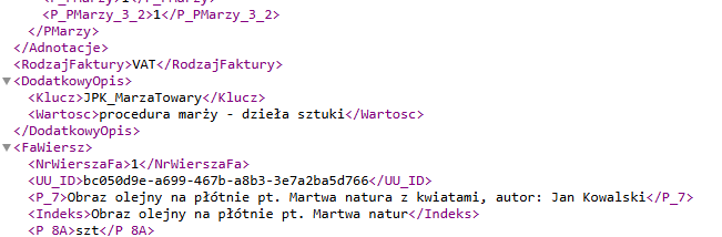 4. Po przesłaniu faktury ustrukturyzowanej do KSeF na fakturze w pliku XML,  w polu Dodatkowy opis pojawi się odpowiednia informacja. W  tym przypadku: procedura marży - dzieła sztuki