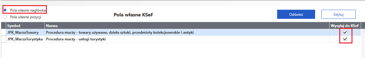 2. Przejście do kartoteki Ustawienia → Ustawienia KSeF → Mapowanie pól własnych sprzedaży → Pola  własne nagłówka. Dla dodanych pól zaznacz parametr Wysyłaj do KSeF
