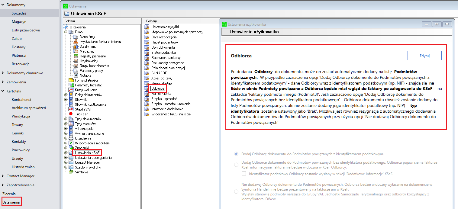 W programie Symfonia Handel, sposób prezentowania i przekazywania danych odbiorcy do KSeF ma kluczowe znaczenie dla poprawności obiegu dokumentów oraz kontroli dostępu do faktur w systemie Krajowy System e-Faktur (KSeF). W zależności od potrzeb organizacji możliwe są trzy różne scenariusze konfiguracji odbiorcy (Podmiotu 3).
