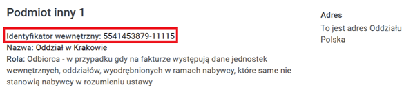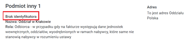 Drugi scenariusz dotyczy sytuacji, w której centrala firmy nie chce, aby oddziały miały dostęp do faktur w KSeF, ale ich dane mają być widoczne informacyjnie na dokumencie. Aby faktura nie była dostępna dla Podmiotu3 wyszczególnionego w dokumencie KSeF, należy ją wysłać do KSeF bez identyfikatora podatkowego (np. NIP-u). Wysyłane są wtedy inne dane Oddziału (nazwa, adres itd.) ale zamiast NIP’u widnieje informacja.