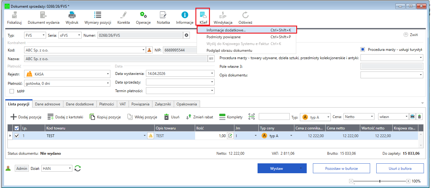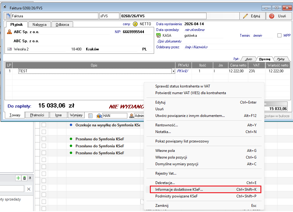 prawy przycisk myszy na dokumencie → Informacje dodatkowe KSeF
