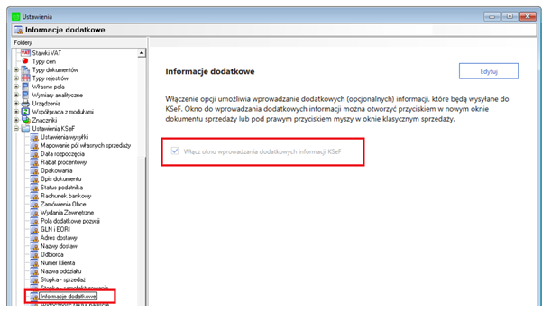 Parametr Informacje dodatkowe został przygotowany dla klientów, którzy przesyłają faktury do KSeF bez dodatkowych (fakultatywnych) informacji. Jego włączenie umożliwia rozszerzenie funkcjonalności dokumentu o możliwość dodawania informacji uzupełniających.