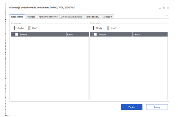 Po aktywacji parametru w systemie dostępne staje się okno „Informacje dodatkowe do dokumentu”, które pozwala na wprowadzenie dodatkowych danych powiązanych z fakturą.