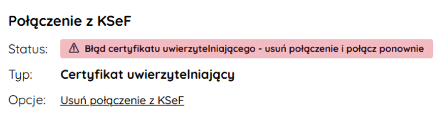 Gdy uwierzytelniasz się w aplikacji Symfonia eBiuro lub szybkafaktura.pl i pojawi się komunikat Błąd certyfikatu uwierzytelniającego - usuń połączenie i połącz ponownie, oznacza to, że musisz uwierzytelnić się w Symfonii KSeF Plus.