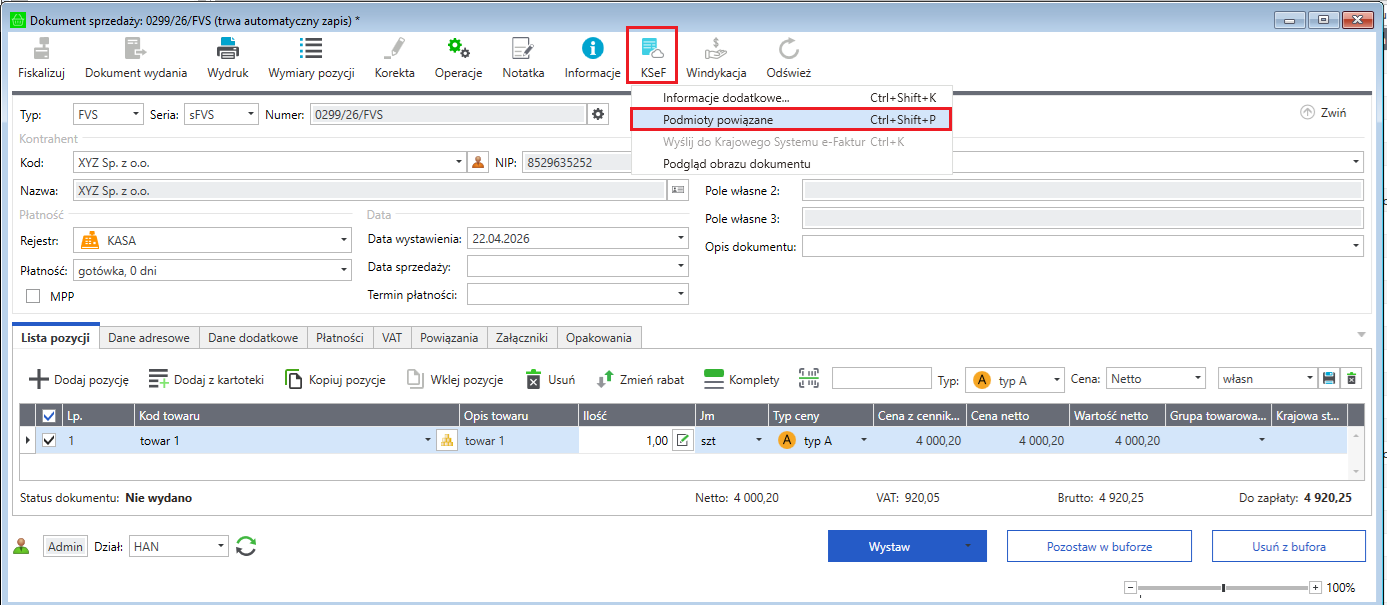- W oknie dokumentu sprzedaży (nowa formatka) kliknij przycisk KSeF i wybierz Podmioty powiązane (Ctrl+Shift+P).