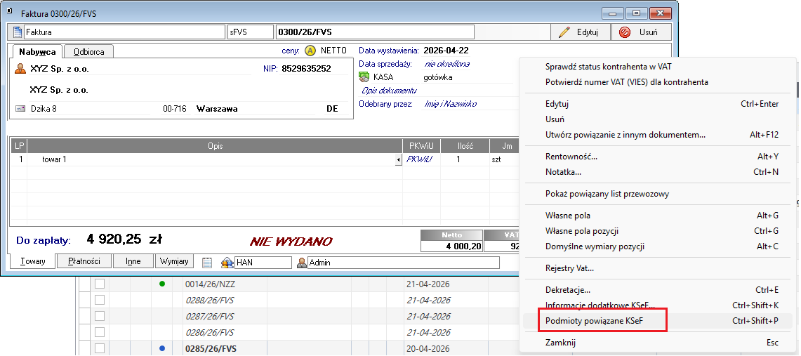 Jeśli pracujesz na klasycznej formacje, kliknij prawym przyciskiem myszy na dokumencie i wybierz funkcję Podmioty powiązane KSeF (Ctrl+Shift+P).